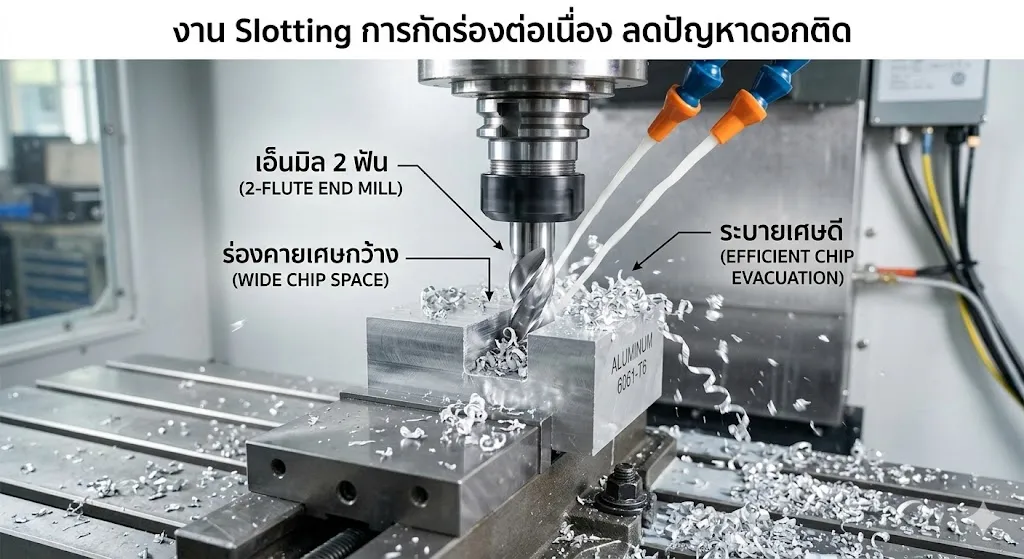การกัดร่องเต็มหน้าดอก (Slotting) เป็นการกัดที่หน้าดอกเอ็นมิลสัมผัสกับชิ้นงานเต็มพื้นที่ของดอก ทำให้เกิดเศษวัสดุจำนวนมากในพื้นที่จำกัด หากใช้ดอกกัดที่มีจำนวนฟันมากเกินไป อาจทำให้เศษสะสมและอุดตันได้ง่าย แต่เอ็นมิล 2 ฟันมีช่องว่างระหว่างฟันมากกว่า จึงช่วยให้เศษถูกคายออกได้สะดวก ลดโอกาสเกิดการติดขัดของดอกกัด และช่วยให้การกัดร่องมีความต่อเนื่องมากขึ้น