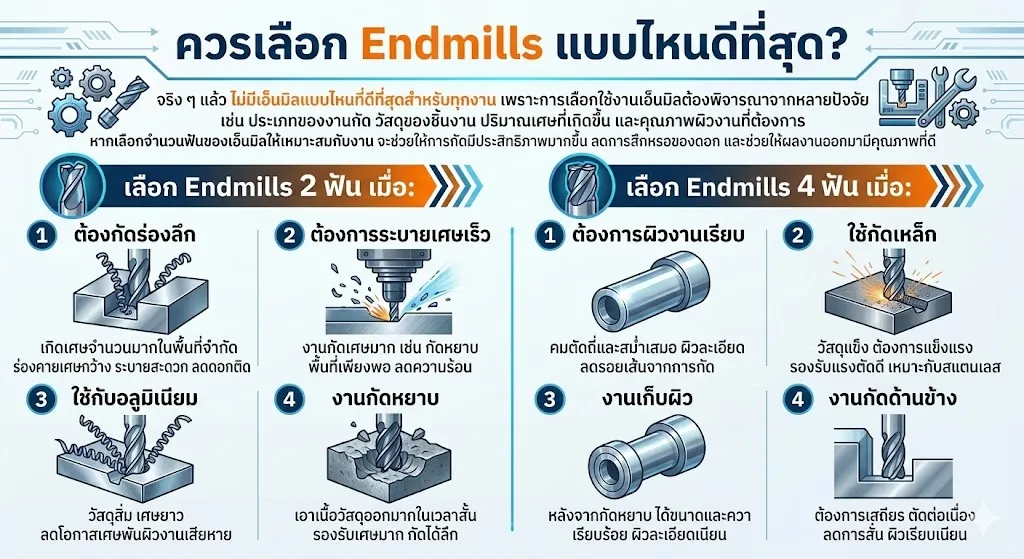 - หากต้องการ กัดเร็ว ระบายเศษดี เหมาะกับงานหยาบหรืออลูมิเนียม → เลือก Endmills 2 ฟัน