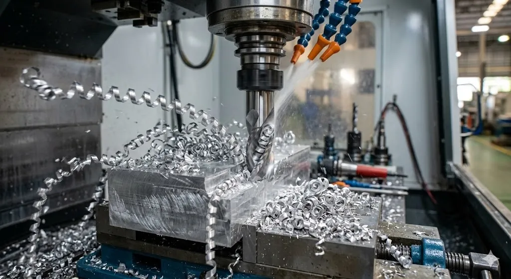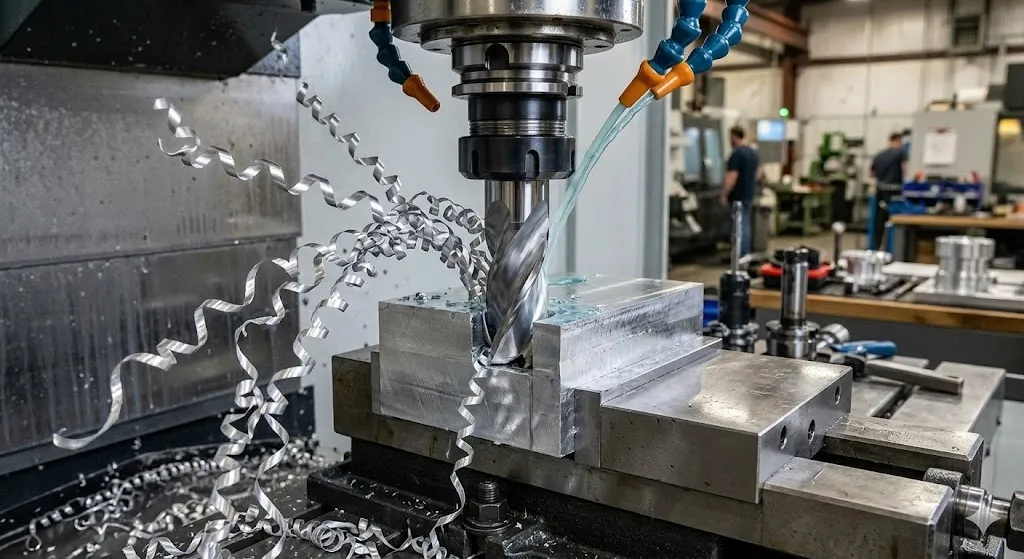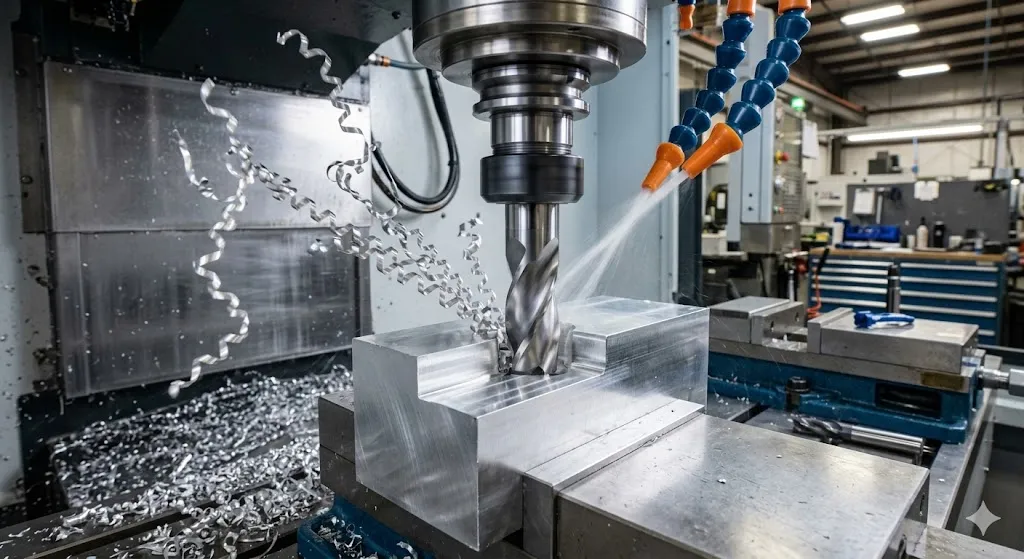 อลูมิเนียมเป็นวัสดุที่มีความนิ่มและมักเกิดเศษที่ยาวและเหนียวระหว่างการกัด หากใช้ดอกเอ็นมิลที่มีจำนวนฟันมาก เศษอาจพันหรืออัดแน่นอยู่ในร่องของดอกกัดได้ง่าย ซึ่งอาจทำให้ผิวงานไม่เรียบหรือดอกเกิดการสึกหรอเร็ว เอ็นมิล 2 ฟันจึงเหมาะกับการกัดอลูมิเนียม เพราะร่องคายเศษที่กว้างช่วยให้เศษถูกระบายออกได้ง่าย ลดโอกาสเกิดการติดของเศษและช่วยให้การตัดเฉือนมีประสิทธิภาพมากขึ้น