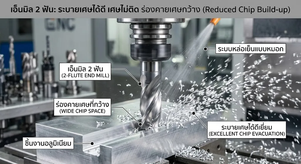 เอ็นมิล 2 ฟันมีร่องคายเศษ (Chip Space) ที่กว้างกว่าดอกกัดที่มีจำนวนฟันมาก เช่น 3 ฟัน หรือ 4 ฟัน ทำให้เศษวัสดุที่เกิดขึ้นระหว่างการกัดสามารถไหลออกจากร่องได้ง่าย เมื่อเศษไม่สะสมอยู่บริเวณคมตัด จึงช่วยลดปัญหาเศษติดดอก (Chip Build-up) และช่วยให้การตัดเฉือนมีความต่อเนื่อง ส่งผลให้การกัดทำงานได้อย่างมีประสิทธิภาพมากขึ้น