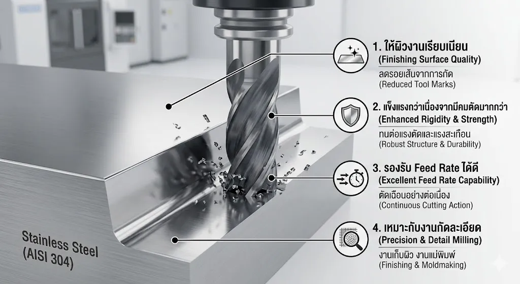 นอกจากนี้ จำนวนฟันที่มากขึ้นยังช่วยให้ การตัดเฉือนเกิดขึ้นถี่ขึ้นในหนึ่งรอบการหมุนของดอกกัด ส่งผลให้ผิวชิ้นงานที่ได้มีความเรียบเนียน ลดรอยการกัด และช่วยให้งานเก็บผิว (Finishing) มีคุณภาพมากขึ้น