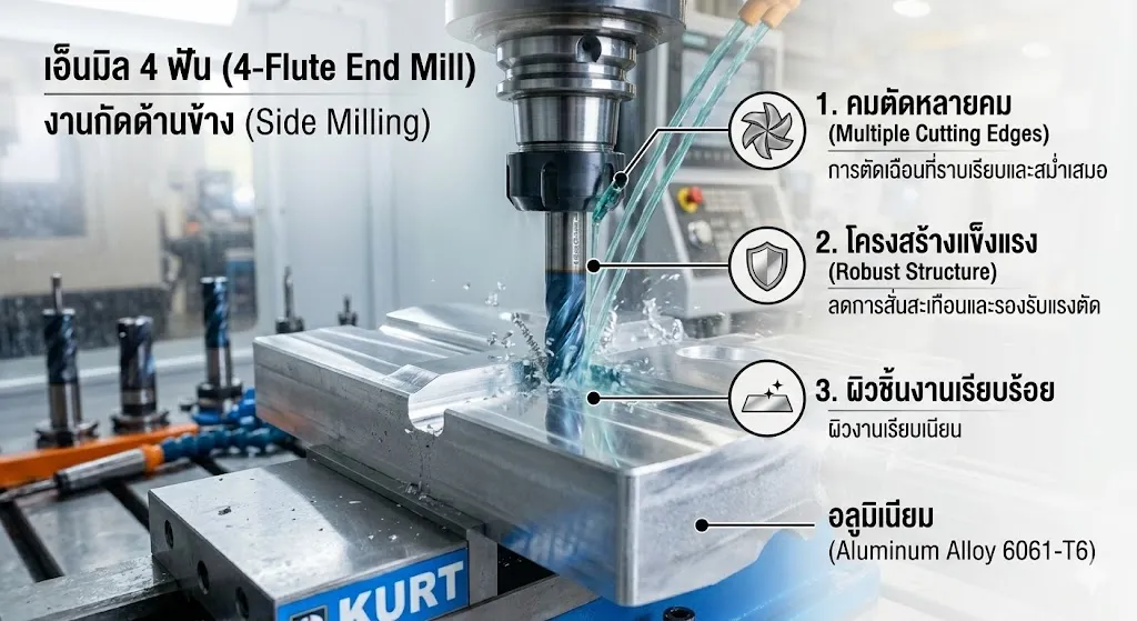 งานกัดด้านข้างเป็นการกัดโดยใช้ด้านข้างของดอกเอ็นมิลสัมผัสกับผิวของชิ้นงาน ซึ่งต้องการความเสถียรของดอกกัดและการตัดเฉือนที่ต่อเนื่อง เอ็นมิล 4 ฟันสามารถรองรับแรงตัดได้ดีและมีคมตัดหลายคม ทำให้การกัดด้านข้างมีความราบเรียบและสม่ำเสมอ ช่วยลดการสั่นสะเทือนของดอกกัด และทำให้ผิวชิ้นงานออกมามีความเรียบร้อยมากขึ้น